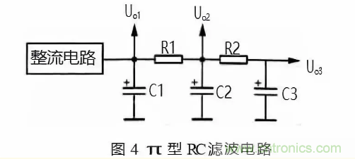 圖 4 所示是 π 型 RC 濾波電路。電路中的 C1、C2 和 C3 是 3 只濾波電容,R1 和 R2 是濾波電阻,C1、R1 和C2 構成第一節 π 型的 RC 濾波電路,C2、R2 和 C3 構成 第二節 π 型 RC 濾波電路。