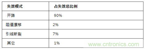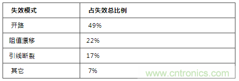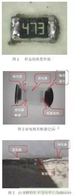 1) 開路:主要失效機理為電阻膜燒毀或大面積脫落,基體斷裂,引線帽與電阻體脫落。