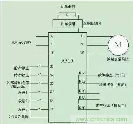 2、S1是正轉(zhuǎn)端子,S2是反轉(zhuǎn)端子,S3是異常、停止端子,S5、S6、S7分別是多段速端子,R1A、R1B、R1C分別是故障常開、常閉與公共點(diǎn),R2A與R2C是頻率檢出端子。