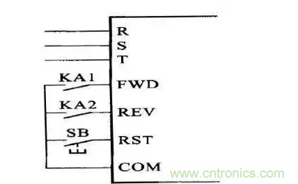 3、找到變頻器的控制端子,在外面加裝2個中間繼電器,分別是KA1與KA2,接線方法如下圖所示,KA1工作時,變頻器正轉(zhuǎn),KA2工作時,變頻器反轉(zhuǎn),SB是復(fù)位按鈕,當(dāng)有異常報警時,變頻器會停機(jī),此時按下RST,可以消除報警,然后再重新啟動變頻器。