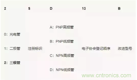 不同的國家/地區對三極管型號命名方式不同。還有很多廠家使用自己的命名方式。