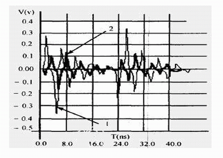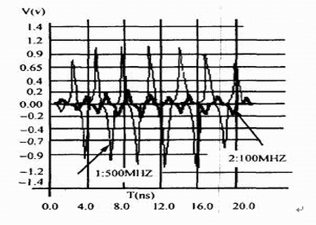 干擾源信號頻率越高,被干擾對象上的串擾幅值越大,我們對圖1中干擾源網絡AB上的信號頻率f1分別取不同頻率值時,對被干擾對象上的串擾進行了仿真,仿真結果見表2,信號頻率不同時的串擾波形見圖5,標記為“1”、“2”箭頭所指的波形頻率分別為“500MHz”、“100MHz”。