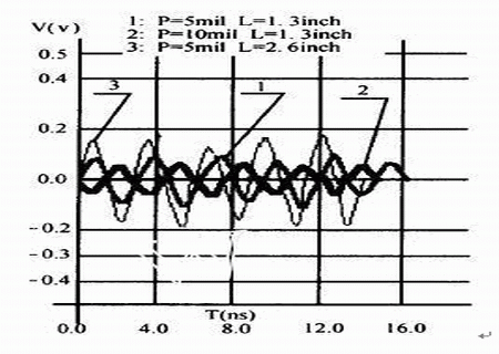 對于圖1所示的兩線系統,我們進行了三種情況的仿真(線網AB上的信號頻率均為100MHz)仿真結果見表3,及圖6.:第一種情況是在兩線間距和平行長度不變的條件下,探測被干擾對象的串擾(標記“1”);第二種情況是在兩線平行長度不變的前提下,將兩線間距增加到10mils,然后探測被干擾對象的串擾標記“2”;第三種情況是在兩線間距不變的條件下,將兩線的平行長度增加到2.6inches標記“3”,然后探測被干擾對象的串擾。由仿真結果可見,當兩線的間距拉大時(P由5mils變為10mils),串擾明顯地減小了,而當兩線的平行長度加長時(L由1.3inches變為2.6inches),串擾顯著增大了。