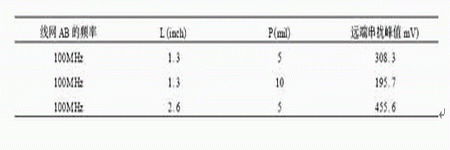 表3 兩線間距P和平行長度L取不同值時的串擾峰值
