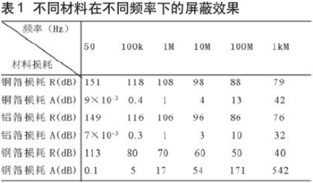 一般常用材料的在不同頻率下的屏蔽效果如表1所示。從表1可以看出較薄的金屬箔也有100dB以上的屏蔽效果。