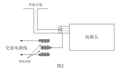 圖2是電視機防雷擊電路,圖中防雷擊電路是在PCB電路板上直接制作放電間隙(6mm)裝置,在外接天線端口就近與電網輸入引線之間加接這種放電間隙裝置。由于電視機本身沒有金屬機殼或機殼接地電氣連接點,所以防雷放電間隙可直接利用電網輸入電源引線代替地線使用。