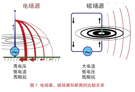 在靠近源的區(qū)域,電場(chǎng)和磁場(chǎng)的關(guān)系非常復(fù)雜;盡管既有電場(chǎng)又有磁場(chǎng),但該區(qū)域要么基本體現(xiàn)為電場(chǎng)要么基本體現(xiàn)為磁場(chǎng)。在遠(yuǎn)離源的區(qū)域,電場(chǎng)和磁場(chǎng)的關(guān)系變得穩(wěn)定了,即E/H=120π。電場(chǎng)和磁場(chǎng)的這種關(guān)系如圖2 所示。EMC從業(yè)者通常采用簡(jiǎn)化和近似的距離,即R=λ/2π,并認(rèn)為場(chǎng)在該處出現(xiàn)從近場(chǎng)到遠(yuǎn)場(chǎng)轉(zhuǎn)變。這個(gè)公式的前提假設(shè)是源結(jié)構(gòu)的尺寸小于半個(gè)波長(zhǎng)。天線的設(shè)計(jì)者們所尋求的更加精確的表達(dá)式可能會(huì)成為上述觀點(diǎn)的一個(gè)例外情況。[page]