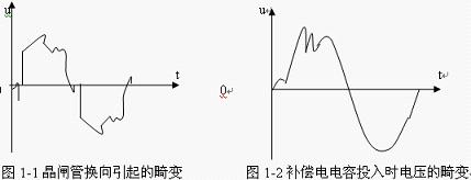 1)晶體管換流設(shè)備對變頻器的干擾:當(dāng)供電網(wǎng)絡(luò)內(nèi)有容量較大的晶閘管換流設(shè)備時,由于晶閘管總是在每相半周期內(nèi)的部分時間導(dǎo)通,容易使網(wǎng)絡(luò)電壓出現(xiàn)凹凸(如圖1-1所示)。它使變頻器輸入側(cè)的整流電路有可能因此出現(xiàn)較大的反向回復(fù)電壓而受到損害。
