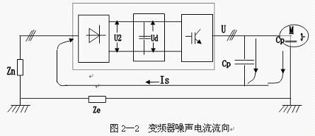 寄生電容Cp存在于電機(jī)電纜和電機(jī)內(nèi)部,因此變頻器的PWM輸出電壓波形的開關(guān)翼部通過寄生電容產(chǎn)生一個高頻脈沖電流Is,使變頻器成為一個諧波干擾源。由于諧波電流Is的產(chǎn)生源是變頻器,因此它一定要流回變頻器。圖中Ze為大地阻抗,Zn為動力電纜與地之間的阻抗。諧波電流流過此二阻抗所造成的電壓降,將影響到同一電網(wǎng)上的其它設(shè)備造成干擾。[page]