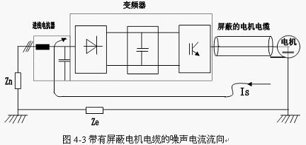 使用屏蔽電機(jī)電纜:對于高頻干擾,如果高次諧波干擾電流Is有一條合理的通道,則高頻干擾是可以得到抑制的。如果使用非屏蔽電纜,則高次干擾諧波電流Is以一個不確定的路線流回變頻器,并在此回路中產(chǎn)生高頻分量壓降,影響干擾其它設(shè)備。為使高次諧波干擾電流Is能沿確定路線流回變頻器,需要采用屏蔽電機(jī)電纜(如圖4-3所示)。電纜屏蔽層必須連接到變頻器外殼和電機(jī)外殼上,當(dāng)高次諧波干擾電流Is必須回變頻器時,屏蔽層形成一條有效的通道。這樣,高次諧波干擾電流就不會在Ze上產(chǎn)生壓降,在Zn上的壓降可由進(jìn)線電抗干擾濾波器來抑制(如圖4-2中的F12)。