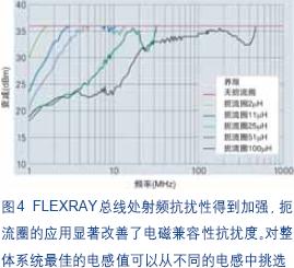 物理層應(yīng)用指南明確指出了對(duì)FlexRay網(wǎng)絡(luò)數(shù)據(jù)線扼流圈的總體要求,比如引線電阻(<1W)、電感(>50mH)以及雜散電感(<1mH)。對(duì)電磁輻射和電磁干擾的測(cè)定與CAN總線一樣。不過(guò),由于10Mbit/s的更高傳輸率,需要更加仔細(xì)地檢查信號(hào)完整性。圖4所示為對(duì)具有各種電感的扼流圈與不使用扼流圈的測(cè)試板進(jìn)行DPI測(cè)定的相應(yīng)評(píng)估結(jié)果。圖五所示為使用另一塊測(cè)試板進(jìn)行電磁干擾測(cè)量的結(jié)果,同樣是針對(duì)具有不同電感的扼流圈。很明顯可以發(fā)現(xiàn),數(shù)據(jù)線扼流圈的使用改善了電磁兼容性并減少了干擾輻射。當(dāng)電感更高時(shí),作用就更大。不過(guò),更高的電感值會(huì)對(duì)信號(hào)完整性產(chǎn)生一定的負(fù)面影響。[page]
