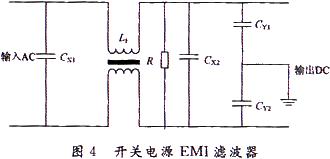 濾波是抑制傳導(dǎo)干擾的一種很好的辦法。在電源輸入端接上濾波器,即可以抑制開關(guān)電源產(chǎn)生并向電網(wǎng)反饋的干擾,也可以抑制來自電網(wǎng)的噪聲對電源本身的侵害。開關(guān)電源的工作頻率一般在10~130kHz,對開關(guān)電源產(chǎn)生的高頻段EMI信號,只要選擇相應(yīng)的去耦電路或網(wǎng)絡(luò)結(jié)構(gòu)較為簡單的EMI濾波器,就能達(dá)到理想的濾波效果。干擾抑制電路如圖4所示,CX1和CX2叫做差模電容,L1叫做共模電感,CY1和CY2叫做共模電容。電阻R用于消除可能在濾波器中出現(xiàn)的靜電積累。IEC-380安全技術(shù)條件標(biāo)準(zhǔn)的8.8部分指出,若CX>0.1μF則R=t/2.2C(t=1s,C=2CXμF)。