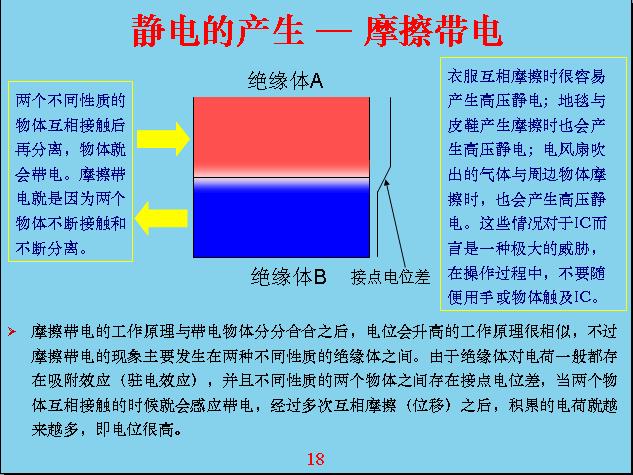 舉一個具體的例子,比如說我現(xiàn)在這個人站在地上,我是光著腳,地板是導電的,這個椅子是絕緣的,我從地面一站到椅子上就相當于我?guī)щ娏恕槭裁矗恳驗槲以瓉硎菢O化帶電,上面帶負電,下面帶正電,我站在地上下面就變成零,上面變成了-100v,站上去的時候相對來說我就變成帶電的人。所以,很多在半導體車間或者和集成電路接觸、打交道的人,不要隨隨便便用人摸集成電路,因為你這個人不知不覺就帶電了,你從門外面走進房子里很可能就帶電了,在上樓梯或者地板鋪有一層絕緣的東西,在絕緣以外的時候你不帶電,站上去就帶電了,因為上面有電層。還有空調的風吹出來的空氣會和你身體上面的衣服進行摩擦、感應,它容易帶電,用靜電筆來測,隨便碰衣服或頭發(fā),上面帶的電基本上都有300v左右,如果摩擦幾下大概就有4000-5000v,所以靜電感應是相當厲害的,很多模型電路在送到工廠的時候就是用盒子包裝,因為盒子是導電的,如果用電表去量它好像沒有電阻,電阻是無窮大,其實它是導電的,相對來說電導率很低,也就是電阻很大。