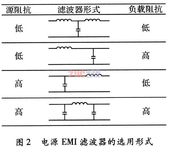 Cy用于抑制較高頻率的共模干擾信號(hào),取值范圍一般為2200~6800 pF。常選用自諧振頻率較高的陶瓷電容。由于接地,共模電容Cy上會(huì)產(chǎn)生漏電流Ii-d。因?yàn)槁╇娏鲿?huì)對人體安全造成傷害,所以漏電流應(yīng)盡量小,通常<1.0 mA。共模電容取值與漏電流大小有關(guān),所以不宜過大,取值范圍一般為2200~4700 pF。R為Cx的泄放電阻。電源濾波器的性能很大程度上取決于其端阻抗,根據(jù)信號(hào)傳輸理論,濾波器輸入端與電源端的端接、濾波器輸出端與負(fù)載端的端接應(yīng)遵循阻抗極大不匹配原則。因此,濾波器設(shè)計(jì)時(shí)應(yīng)遵循:(1)源內(nèi)阻是高阻(低阻)的,濾波器輸入阻抗就應(yīng)該是低阻(高阻);(2)負(fù)載是高阻(低阻)的,則濾波器輸出阻抗就應(yīng)該是低阻(高阻)。對EMI信號(hào)來說,電感是高阻,電容是低阻,則有圖1中的4種濾波器選用類型。