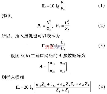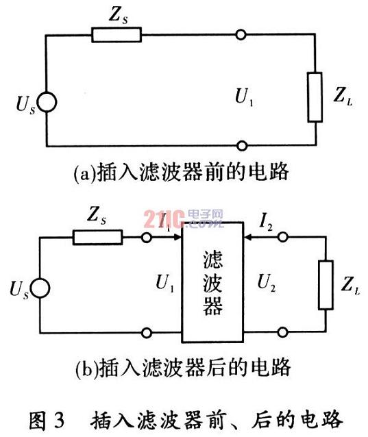 插入損耗是評價(jià)濾波器性能的主要指標(biāo),它是頻率的函數(shù)。插入損耗的定義為,沒有濾波器接入時(shí),從噪聲源傳輸?shù)截?fù)載的功率P1和接入濾波器后噪聲源傳輸?shù)截?fù)載的功率P2之比,用dB表示。插入損耗越大,說明濾波器抑制干擾的能力越強(qiáng)。濾波器接入前后的電路圖,如圖3(a)和圖3(b)所示。濾波器的插入損耗由式(1)表示。