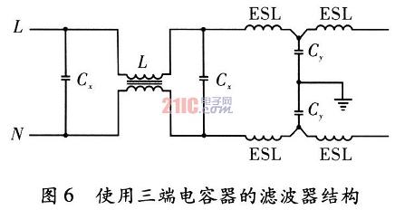 線路旁通電容Cy是用來消除高頻噪聲的組件,基于對今后開關(guān)操作頻率的高頻化考慮,宜選用能消除頻率高達(dá)1000MHz噪聲的電容器。而一般的兩端結(jié)構(gòu)的旁通電容器僅能消除30MHz左右的噪聲。由以上介紹可知,相對兩端電容器來說,三端電容器能更好地抑制高頻噪聲。以EMI濾波器的一般結(jié)構(gòu)為基礎(chǔ),用三端電容器替代其中的兩端旁通電容Cy,電路圖,如圖6所示。其中ESL為三端電容器信號(hào)線上的等效串聯(lián)電感。