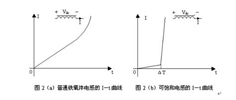 普通鐵氧體電感和可飽和電感在直流電壓Vdc作用下的電流強(qiáng)度I隨時(shí)間t變化的曲線如圖2(a)和圖2(b)所示。