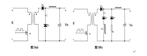 在圖3(a)所示的正激電源電路中,當(dāng)初級(jí)功率管V1開(kāi)始導(dǎo)通,次級(jí)整流二極管D1開(kāi)始導(dǎo)通,D2開(kāi)始截止時(shí),由于二極管PN結(jié)的電荷存儲(chǔ)效應(yīng),D2中流過(guò)了電流變化率di/dt很大的反向恢復(fù)尖峰電流i,致使V1、D1中也有相應(yīng)的尖峰電流流過(guò),在漏感、線電感等因素的共同作用下會(huì)在電源輸出端產(chǎn)生高頻的導(dǎo)通噪聲。在D2上施加的反向電壓越大,D2的反向恢復(fù)時(shí)間越長(zhǎng),反向恢復(fù)電流變化率di/dt就越大,電源輸出噪聲也就越大。大的反向恢復(fù)尖峰電流,不僅會(huì)產(chǎn)生電源噪聲,也容易損壞整流器件。[page]