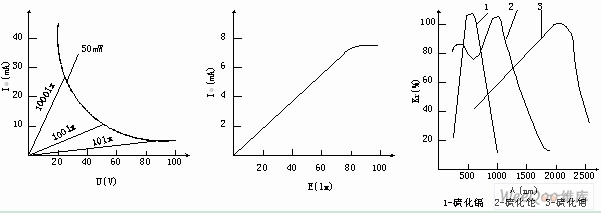 圖2 光敏電阻的伏安特性 圖3 光敏電阻的光電特性 圖 4 光敏電阻的光譜特性