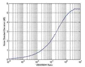 指定視頻濾波器關閉(或不小于3倍RBW)的目的,是為了消除視頻濾波器對檢測到的信號的影響。圖4是視頻帶寬(VBW)與RBW之比變化時視頻帶寬的影響。在VBW≥3*RBW或10*RBW(或失效)時,噪聲標準偏差保持在5.4dB.在VBW=RBW時,例如在TELEC規范部分章節中,噪聲變化降低到大約4.7dB.