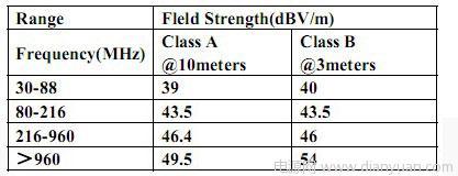 EMI測試是在特定的電波暗室中進行的,測量由產(chǎn)品中輻射出來的電磁波強度,與FCC等規(guī)范相比較,不得超過規(guī)定的最大能量。FCC規(guī)范中將產(chǎn)品按用途分為CLASS A 、CLASS B 兩大類,A 類為用于商務(wù)或工業(yè)用途的產(chǎn)品,B 類為用于家庭用途的產(chǎn)品, FCC 對 B 類產(chǎn)品法規(guī)要求更嚴(yán)格。下表顯示的是FCC 規(guī)范的CLASS A和CLASS B標(biāo)準(zhǔn):