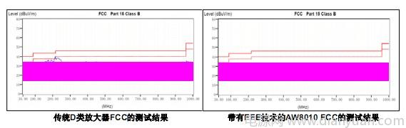 下面是傳統(tǒng)D類放大器和帶有EEE技術(shù)的AW8010的EMI測試結(jié)果,測試使用60cm(24inch)的輸出線。上面的紅色實線是FCC CLASS B的標(biāo)準(zhǔn)線,紅色虛線是-6dB的裕量線,藍(lán)色的線是實際測試曲線,粉色的線是測試環(huán)境的EMI背景噪音。