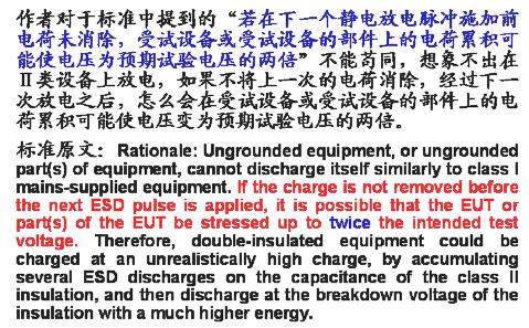 關于不接地設備的試驗配置,新版標準與舊版標準的配置是相同的。關鍵是在單次放電時(無論是空氣的,還是接觸的),試品上的電荷應當在每次施加靜電放電脈沖之前先行釋放(釋放掉在需要施加靜電放電的金屬點或金屬部位上的電荷)。