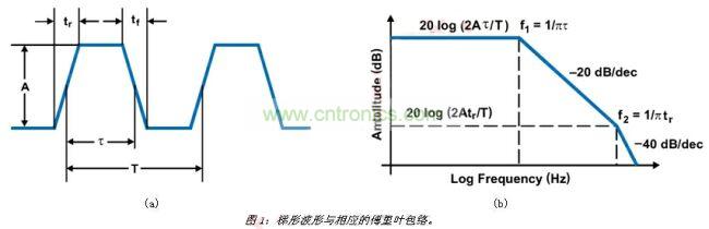 對于CCM中運作的降壓轉換器,電感電流一直是非零的正電流。在這種情況下,負載周期為D=Vout/Vin,在本例中為38%(5V/14V)。使用200kHz的開關頻率時,我們很快計算出導通時間為1.8μs。為支持此頻率,控制開關的上升/下降時間必須小于90納秒。這使得我們注意到第一個減少噪聲的方法,也就是斜率控制。您可能還無法理解,但是此時我們非常了解與PWM切換節點有關的諧波,也就是開關穩壓器的控制波形。如果將此波形以圖1(a)中所示的梯形表示,波形的諧波便能夠以圖1(b)中的內容表示,這表明了EMI背后的驅動因素。這一傅里葉包絡定義了可通過傅里葉分析或計算梯形波形導通時間及上升時間取得的諧波振幅。