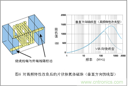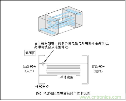 通過前記圖3中介紹的片狀鐵氧體磁珠阻抗頻率特性可以看出,阻抗值以 400-500MHz范圍為界開始減少。這是由于片狀磁珠的結(jié)構(gòu)所帶來的影響。一般來說,電感器的阻抗會隨著頻率的上升而逐步增大。然而,如圖5所示,普 通的片狀鐵氧體磁珠內(nèi)部在繞線始端(入口)和終端(出口)附近會存在相互較為接近的部位。由于這個部分會發(fā)生靜電耦合(存在一個微型電容的狀態(tài)),高頻電 流通過這里時會出現(xiàn)不容易受電感器阻抗影響的情況。由于頻率越高,靜電耦合部分越容易通過,因此頻率越高所顯示的阻抗也就越低。