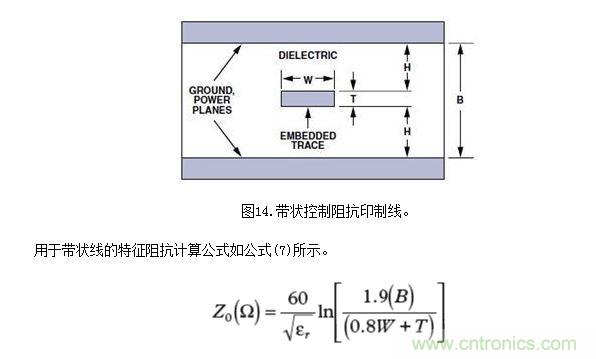 帶狀控制阻抗印制線(參見圖14)采用了兩層接地平面,信號印制線夾在其中。這種方法使用了較多的印制線,需要的PCB層數更多,對電介質厚度變化敏感,而且成本更高--所以通常只用于要求嚴格的應用中。