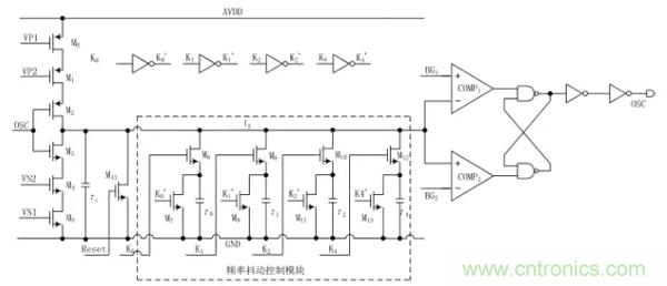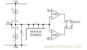 由圖1可以看出,頻率抖動振蕩器由一個張弛振蕩器加上一個頻率抖動模塊構成。其工作原理:首先,開關 S1閉合,電流源 I0給電容 Cc充電,充電剛開始時電容 Cc上極板的電壓小于 BG1和 BG2,RS 觸發器的輸出被置為低電平 0,當電容上極板電壓 VA大于 BG2時,RS 觸發器的輸出狀態處于保持狀態,直到上極板電壓 VA大于 BG1之后 RS 觸發器的輸出翻轉被置為高電平1;此時,開關 S2導通,電流源 I1給電容Cc放電,當VA減小到小于 BG1時,RS 觸發器的輸出處于保持狀態,當VA減小到小于 BG2時,RS 觸發器翻轉被置為低電平 0 ;于是,開關 S1又閉合開始對 Cc充電,如此周而復始,得到一個頻率固定的振蕩器。圖1中的電流源I0、 I1的電流相等,則振蕩器的占空比為 0.5。頻率抖動控制模塊是通過計數器來周期性的切換加入到張弛振蕩器中充放電電容的大小,改變電壓 VA的充放電速度,從而來達到周期性的改變振蕩器頻率的目的,即實現了振蕩器頻率的抖動。