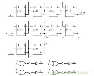本文中所設計的頻率抖動控制模塊是通過計數器來控制圖 2 中 M6~ M12開關管的通斷來周期性的改變充放電電容的大小來實現的。頻率抖動控制模塊的電路圖如圖 3 所示,由7 個 D 觸發器串聯構成 512 分頻觸發器,第 8 個 D 觸發器的輸出信號加入到異或門用于實現計數器 K4,K2,K1,K0加減法計數切換,保證加入到張弛振蕩器中的電容不會出現瞬時的大容值的變換,從而引起振蕩器的振蕩頻率有過大的變化。本文中所設計振蕩器的中心頻率為100 kHz,頻率抖動范圍為±4 kHz,頻率從 96 kHz,100 kHz,104 kHz 周期性地變化,頻率抖動周期為 5 ms。