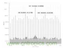 圖 6、圖 7 分別為對不加頻率抖動和加了頻率抖動進行傅里葉分析的頻譜圖,對比圖 6 和圖 7 可以看出加了頻率抖動電路之后在固定頻率處的頻譜幅值下降了大約11 dB,由此可見頻率抖動電路對減小 EMI 的效果非常明顯。