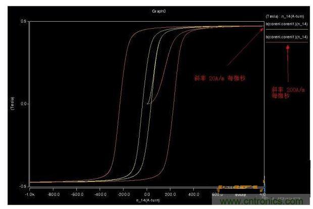 用三角波仿真了下磁芯,磁滯回線方正了很多,也不會(huì)因?yàn)檎乙?guī)律產(chǎn)生嚴(yán)重的拖尾效應(yīng)。圖2是同頻率不同幅度。圖3同斜率不同幅度的。