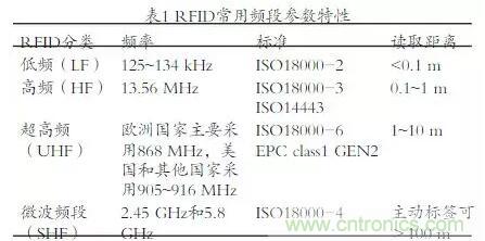 在應用方面,低頻和高頻的電子標簽,讀取距離較短、數據量少,因此適合用于近距離的識別。超高頻系統由于具有不同的電磁感應方式,讀寫器和標簽的讀取距離可>10 m,數據速率可達640 kbps。RIFD常用頻段參數特性,見表1。