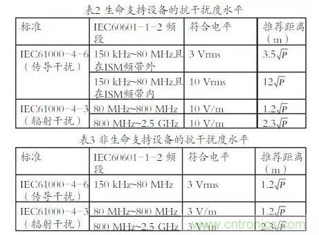 在IEC 60601-1-2《醫用電氣設備第1-2部分:安全通用要求并列標準:電磁兼容要求和試驗》中,規定了對生命支持設備和非生命支持設備的電磁抗擾度,他們的抗干擾水平分別為10 V/m和 3V/m 。生命支持設備主要指呼吸機、血透機等對維持患者生命起著關鍵作用的醫療設備,相較于非生命支持設備,這類設備的安全性能要求更為嚴格,抗電磁干擾水平也高于非生命支持設備。在IEC61000-4-3《電磁兼容性(EMC)第4-3部分:測試及測量技術—放射性、射頻式、電磁場抗干擾度試驗》針對所有電子電氣設備的電磁兼容標準中,醫療設備屬于其中的水平等級3和水平等級2。低頻率的干擾主要來源于傳導發射產生的干擾電壓;而高頻率的干擾主要來源于輻射發射產生的電磁干擾場強。同時在IEC60601-1-2標準中,也給出了在電磁環境中醫療設備抗干擾度的推薦距離,在相同的發射功率下,生命支持設備的抗電磁干擾水平要高于非生命支持設備,推薦距離也相對較遠,如表2~3所示。
