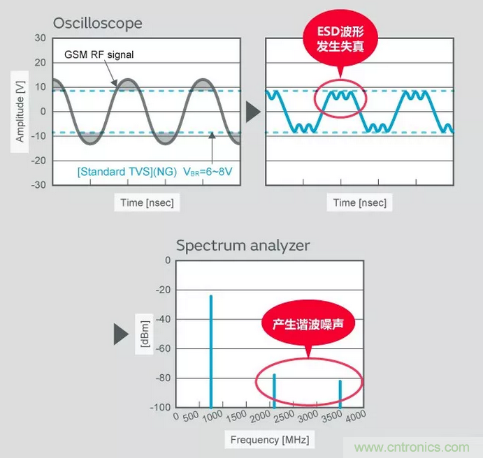 一般使用TVS的場合,即使信號振幅超過TVS的擊穿電壓(VBR)的一瞬間,信號波形也會失真。因此,信號頻率外諧波噪聲發生,受其他信號干擾,都會導致天線的接收靈敏度降低。
