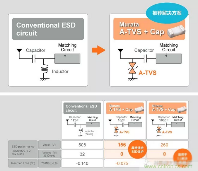 A-TVS和電容器組合,比較電感器和電容器組合的ESD保護(hù)性能。A-TVS和電容器的組合可更有效地抑制ESD。