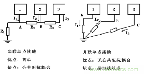 接地沒有一個很系統的理論或模型,人們在考慮接地時只能依靠他過去的經驗或從書上看到的經驗。接地的方法很多,具體使用那一種方法取決于系統的結構和功能。接地的方式可以分為三種:單點接地,多點接地和混合接地。其中單點接地可以分為串聯單點接地和并聯單點接地兩種,如圖所示。
