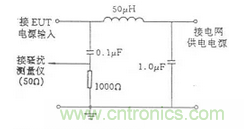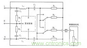 連續(xù)騷擾電壓測量主要測量EUT沿著電源線向電網發(fā)射的騷擾電壓,測量頻率為0.15~30MHz。測量一般在屏蔽室內進行。測量時需要在電網和EUT之間插入一個人工電源網絡(LISN或AMN),其原理如圖15所示。AMN的作用是隔離電網和EUT,使測到的騷擾電壓