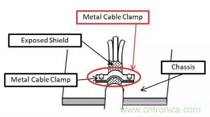 一個好的電磁干擾屏蔽是通過一個完整的360°外殼周圍的保護裝置來完成。完整的360°屏蔽是環(huán)繞整個受保護設(shè)備(例如電纜)并將其連接到底盤(見圖1)的環(huán)向終止端子上。