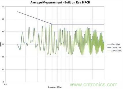 我通過簡單調(diào)整電路板(無電路變化),將噪聲降低了大約 6dB。見圖 2 和圖 3 的測量結(jié)果。在有些情況下,接近高 dV/dt 進行輸入線路布線甚至還可擊壞共模線圈 (CMC)。