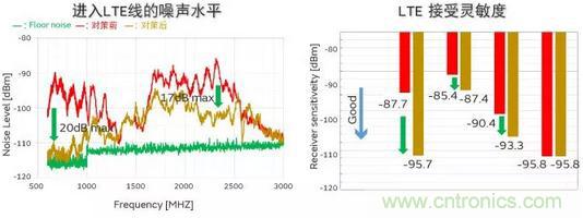 通過這些對策,如圖8所示,天線中進(jìn)入的噪聲最大可降低20dB,LTE的接收靈敏度取決于頻帶,改善了8dB。