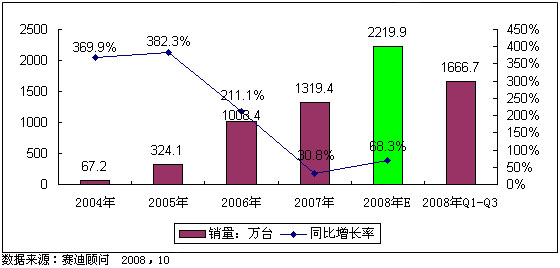 進(jìn)入2008年,中國(guó)數(shù)字電視產(chǎn)業(yè)特別是有線數(shù)字電視產(chǎn)業(yè)保持了快速發(fā)展的勢(shì)頭,數(shù)字電視機(jī)頂盒市場(chǎng)與數(shù)字電視整體轉(zhuǎn)換同步發(fā)展,市場(chǎng)規(guī)模不斷增長(zhǎng)。2008年前三季度中國(guó)機(jī)頂盒市場(chǎng)銷量迎來(lái)井噴,賽迪顧問(wèn)的調(diào)研數(shù)據(jù)顯示,前三季度中國(guó)市場(chǎng)共銷售機(jī)頂盒1666.7萬(wàn)臺(tái),同比增長(zhǎng)了83.4%。