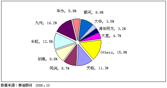 在品牌市場(chǎng)方面,九洲在2008年全面發(fā)力,國(guó)內(nèi)國(guó)際市場(chǎng)雙豐收;長(zhǎng)虹繼續(xù)有穩(wěn)定的表現(xiàn),以12.5%的份額位居品牌排名第二位;天柏和同洲銷量也持續(xù)增加,分別位于市場(chǎng)第三和第四位,銷售量市場(chǎng)占有率為11.3%和9.7%。值得一提的是,隨著市場(chǎng)銷量的暴漲,除TOP10之外,其它品牌也有了較好的表現(xiàn),市場(chǎng)份額有了較大的提高。相比2007年,前十名企業(yè)的市場(chǎng)集中度出現(xiàn)了下滑,究其原因,主要是因?yàn)槭袌?chǎng)增長(zhǎng)很快,主流企業(yè)的生產(chǎn)規(guī)模和影響力難以滿足全部新增市場(chǎng)的需求,不少地方性的小企業(yè)搶占市場(chǎng)所致。