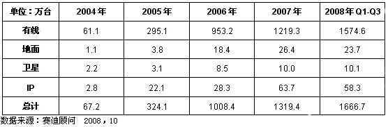 表1 2004-2008年前三季度中國(guó)數(shù)字電視機(jī)頂盒銷量產(chǎn)品類型結(jié)構(gòu)變化