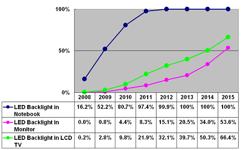 同時,2013年采用LED背光的大尺寸(指10寸及以上尺寸)面板出貨量將從2009年約8千490萬片成長到4億3千480萬片,將占LED背光市占率估計為54.3%,LED背光將成為市場主流規格。其中notebook PC將是LED背光主要應用,依據DisplaySearch分析到了2012年百分之百notebook PC都將采用LED背光。