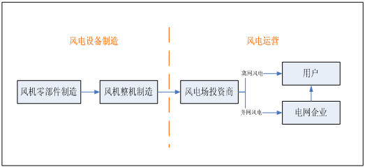 風力發電產業鏈總體上分為風電設備制造和風電運營兩個環節,其中風電設備制造又可細分為風機零部件制造和風機整機制造,風電運營從風電場投資開始,按照運營模式的不同分為并網和離網兩種,并網風力發電以運營商為主體構建整個體系,離網風力發電以銷售商為主體構建整個體系,風力發電產業鏈如下圖所示??傮w上風機零部件及整機制造處于初創期向成長期的過渡階段,風電運營處于成長期。