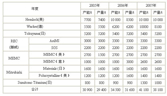 表1 2005-2007年國外硅材料企業的產能和產量情況