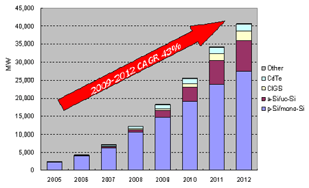 圖一 2005-2012全球太陽(yáng)能電池按技術(shù)種類產(chǎn)能預(yù)測(cè)(單位: 百萬(wàn)瓦)